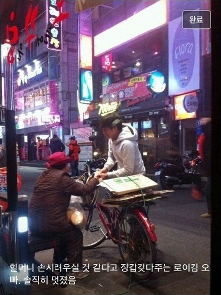 사진 속 로이킴은 한겨울에도 거리에서 폐지를 줍는 할머니에게 무언가를 건네고 있다. 사진의 하단부에 ‘할머니 손 시리실 것 같다고 장갑 갖다주는 로이킴 오빠. 솔직히 멋졌음’이라고 적혀 있어 더욱 따뜻함을 자아냈다.