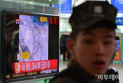 북한이 3차 핵실험을 강행한 것으로 알려진 12일 오후 서울역 대합실에서 한 군인이 뉴스 속보를 시청하고 있다.
