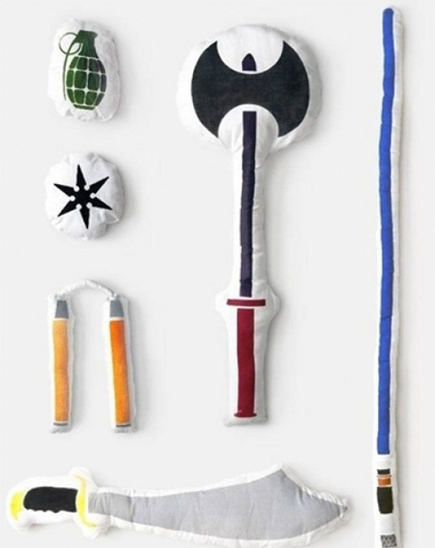 그러나 자세히 보면 베게로 실소를 자아낸다. 베게싸움을 위해 베게에 각종 무기 무늬를 그려넣은 아이디어 상품이다.