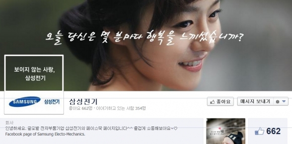 13일 삼성전기에 따르면 이 회사는 지난달 29일 공식 페이스북(www.facebook.com/SamsungElectroMechanics)을 오픈하고 지난 6일까지 백화점 상품권 등을 증정하는 오픈 이벤트를 열었다.