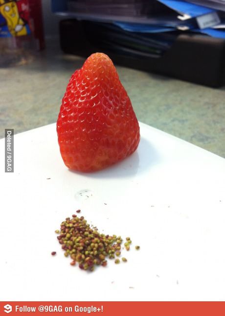 사진의 딸기는 유전자 조작등의 방법이 아닌 손으로 일일이 씨앗을 빼낸 것으로 보이는 딸기가 놓여있다. 딸기 옆에는 해당 딸기에서 빼 낸 듯한 씨앗이 쌓여 있다.