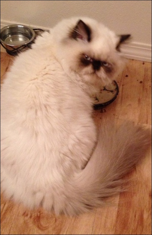 날카로운 표정으로 이 고양이가 지키고 있는 것은 다름 아닌 자신의 밥그릇이다. 게시자는 "우리 집 고양이는 밥 먹을 때 누가 방해하면 화를 내요"라며 고양이의 표정을 설명했다.