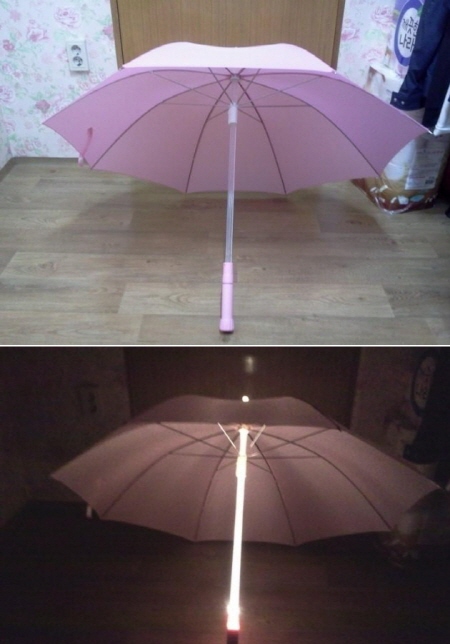 사진 속 분홍색 우산은 어두운 방안에서 우산손잡이대 부분이 형광등 처럼 빛나는 모습으로 탈바꿈해 있다. 마치 영화 '스타워즈'를 연상케 하는 모습이 보는이로 하여금 웃음을 자아냈다.