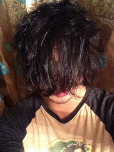 사진 속에는 앞머리를 얼굴 쪽으로 길게 늘어트려 정돈되지 않는 머리스타일을 하고 있는 하하의 모습이 담겨있다.