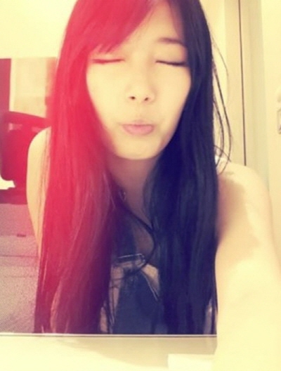 사진 속 수지는 눈을 감고 입술을 내밀며 귀여운 표정을 짓고 있다.