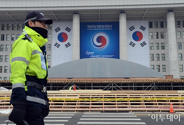 제18대 대통령 취임식을 일주일 앞둔 18일 오전 국회의사당 본관 앞 취임식장 준비가 한창인 가운데 국회 의경들이 경비 근무를 서고 있다.