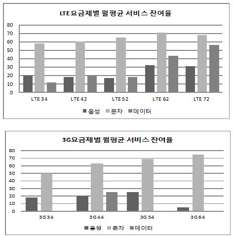또 LTE 62요금제 사용자도 기본 제공량 중 음성통화 68.0%, 문자서비스 28.6%, 데이터통신 56.7%를 사용하고 있어 결과적으로 필요이상의 요금을 부담하는 것으로 조사됐다.