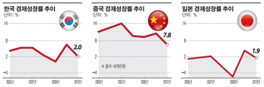 한국은 2012년 성장률이 2.0%에 그쳤다. 올해 성장률도 한국은행 목표인 2.8%에 미달할 가능성을 배제할 수 없는 상태다.