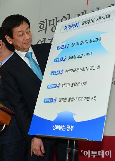 진영 대통령직인수위원회 부원장이 21일 오후 서울 종로구 삼청동 인수위 공동기자회견장에서 열린 ‘국정비전 및 국정과제 발표 기자회견’에서 5개 국정목표를 바라보고 있다.