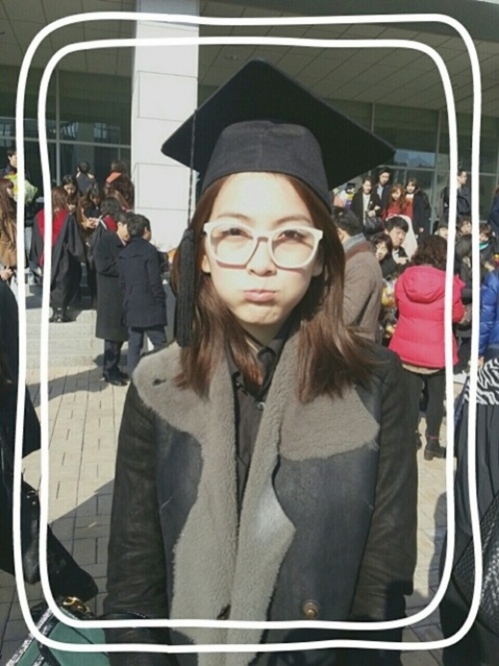 사진 속 강지영은 대학 졸업식장으로 보이는 곳에서 학사모를 쓰고 있는 모습이다. 커다란 안경을 쓰고 볼에 바람까지 넣은 귀여운 표정이다.