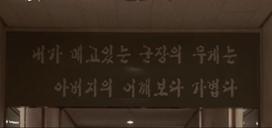 군부대 훈련소에 걸려 있는 이 문구의 내용은 '내가 메고 있는 군장의 무게는 아버지의 어깨보다 가볍다'였다. 이는 아버지이자 가장으로서의 책임감이 얼마나 무거운지를 설명하는 것으로 보는 이의 가슴을 가슴 뭉클하게 한다.
