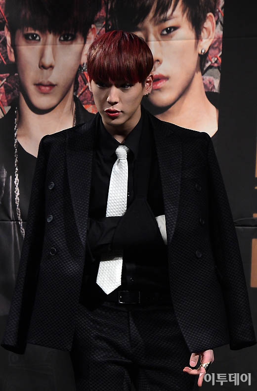 얼마전 손가락 골절 부상을 당한 힘찬은 24일 오후 서울 방이동 올림픽공원 올림픽홀에서 열린 B.A.P(비에이피) 단독 콘서트 '라이브 온 어스(LIVE ON EARTH)' 공연에 앞서 마련된 기자간담회에 깁스를 한 모습으로 등장했다.
