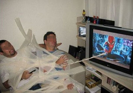 사진 속 두 남성은 온몸에 붕대를 감은 채 영화 '스파이더맨'을 감상하고 있다. 특히 거미줄이 마치 TV 화면에서 튀어나온 것 같은 모습과 TV 화면에 적힌 'TV4D' 글자는 보는 이들의 웃음을 자아낸다.