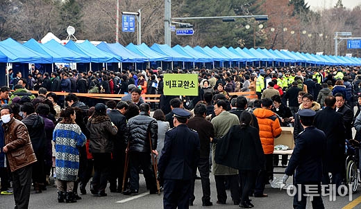 제18대 대통령 취임식이 예정된 25일 오전 서울 여의도 국회의사당 인근이 비표를 발급받기위해 몰린 시민들로 북적이고 있다.