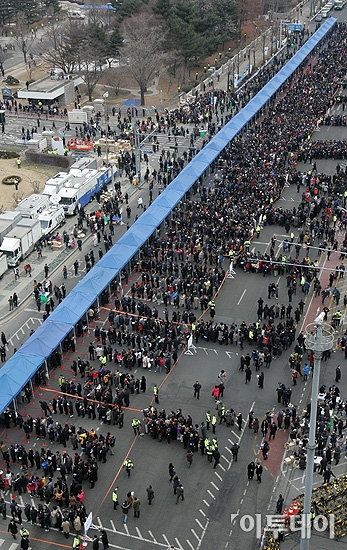 [사진공동취재단]25일 오전 서울 여의도 국회의사당에서 열리는 제18대 박근혜 대통령 취임식 관람객들이 길게 줄지어 입장하고 있다.