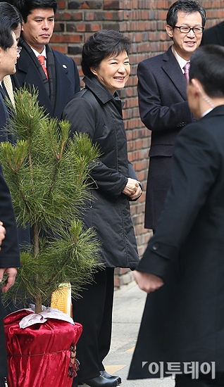[사진공동취재단]박근혜 대통령이 25일 오전 서울 강남구 삼성동 자택에서 나와 시민들과 인사를 나누고 있다. 첫 여성 대통령 시대를 여는 제18대 대한민국 박근혜 대통령의 취임식은 국회의사당 광장에서 약 7만명의 국민이 운집한 가운데 세대를 아우르는 국민대통합을 기치로 열린다.
