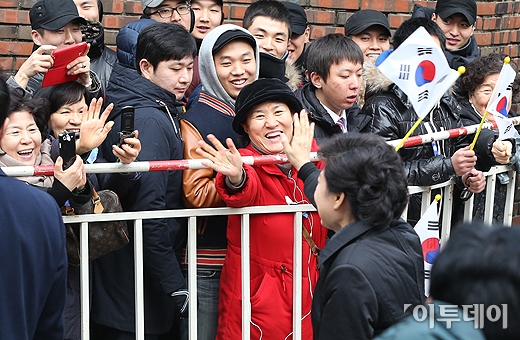 [사진공동취재단]박근혜 대통령이 25일 오전 서울 강남구 삼성동 자택에서 나와 시민들과 인사를 나누고 있다. 첫 여성 대통령 시대를 여는 제18대 대한민국 박근혜 대통령의 취임식은 국회의사당 광장에서 약 7만명의 국민이 운집한 가운데 세대를 아우르는 국민대통합을 기치로 열린다.
