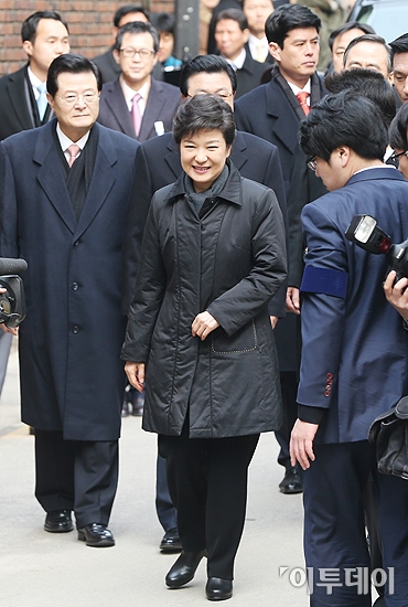 [사진공동취재단]박근혜 대통령이 25일 오전 서울 강남구 삼성동 자택에서 나와 시민들과 인사를 나누고 있다. 첫 여성 대통령 시대를 여는 제18대 대한민국 박근혜 대통령의 취임식은 국회의사당 광장에서 약 7만명의 국민이 운집한 가운데 세대를 아우르는 국민대통합을 기치로 열린다.
