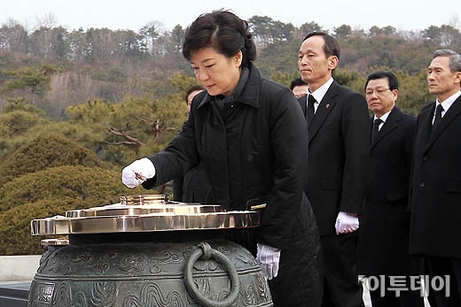 [사진공동취재단]취임식을 앞두고 있는 박근혜 대통령이 정부대표를 비롯해 국가유공자 및 현충원 안장 유가족 등과 함께 25일 오전 서울 동작구 국립현충원을 찾아 참배하고 있다.