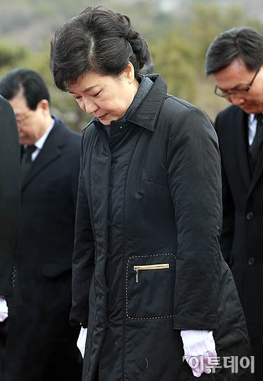 [사진공동취재단]취임식을 앞두고 있는 박근혜 대통령이 정부대표를 비롯해 국가유공자 및 현충원 안장 유가족 등과 함께 25일 오전 서울 동작구 국립현충원을 찾아 참배하고 있다.