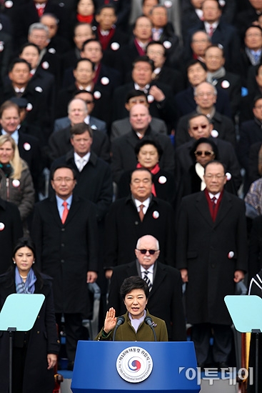 [사진공동취재단]박근혜 대통령이 25일 서울 여의도 국회의사당 광장에서 열린 18대 대통령 취임식에서 취임선서를 하고 있다.