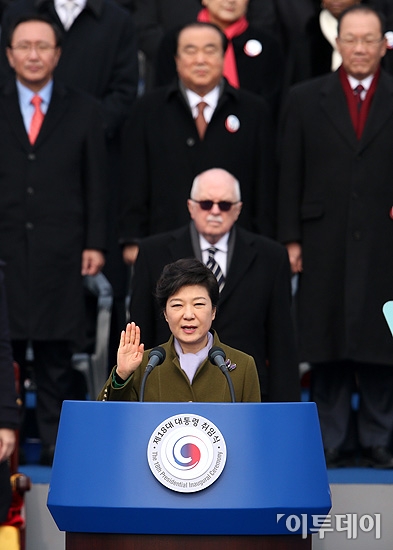 [사진공동취재단]박근혜 대통령이 25일 서울 여의도 국회의사당 광장에서 열린 18대 대통령 취임식에서 취임선서를 하고 있다.