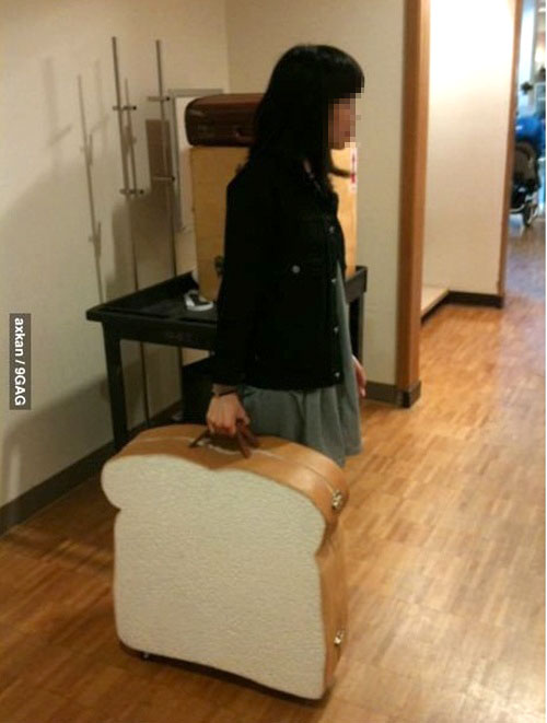 특히 이 여성이 들고 있는 여행 가방의 디자인이 식빵 모양으로 돼 시선을 사로잡는다. 독특한 '식빵 모양 여행 가방'이 실제 식빵 모양을 그대로 본 따고 있는 것.