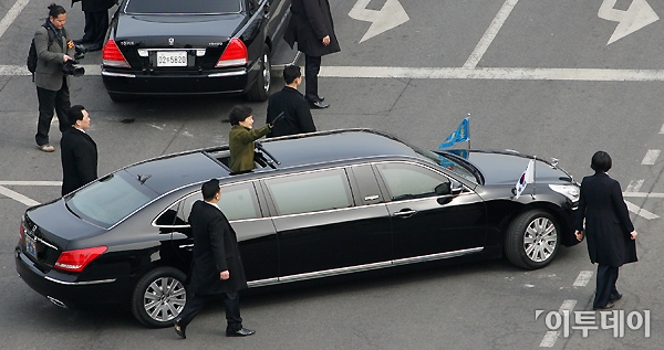 [사진공동취재단]박근혜 제18대 대통령이 25일 오전 서울 여의도 국회의사당에서 열린 취임식을 마친 후 국회의사당을 빠져 나가며 시민들의 환호에 답하고 있다.