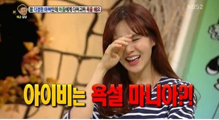 아이비는 25일 방송된 KBS 2TV '안녕하세요'에 출연했다. 그는 이날 다정한 아빠지만 다짜고짜 욕을 하는 아빠 때문에 고민이라는 아들의 사연을 소개하는 자리에서 자신이 욕설 마니아라는 사실을 털어놨다.