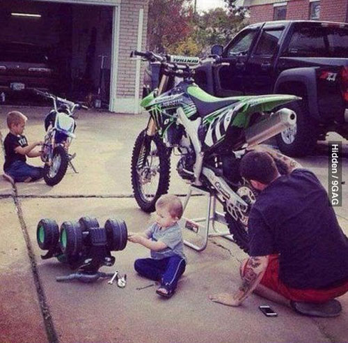 공개된 사진에는 성인 남자와 어린 남자아이, 그리고 남자 아기까지 바이크 손질에 열중하고 있는 모습이다.