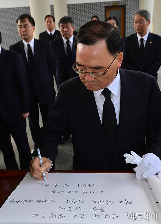 정홍원 신임 국무총리가 27일 오전 서울 동작구 국립현충원을 찾아 참배 후 방명록을 작성하고 있다.