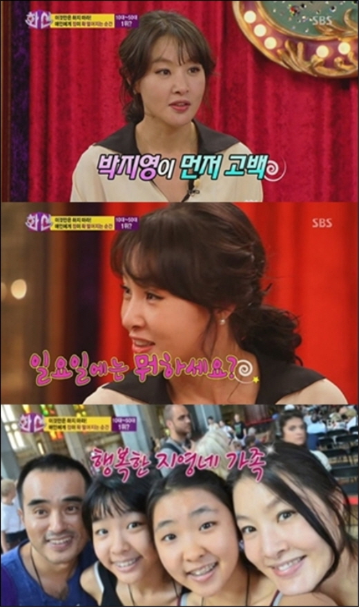 박지영은 이어 "남들 예상과 달리 남편에게 내가 먼저 대시했다. 1993년 SBS '오박사네 사람들'이란 시트콤에 출연할 때 남편이 조연출이었는데 늘 세트 뒤에서 함께 등장을 기다렸다"며 "그때마다 내가 계속 '오늘 뭐 하세요?', '일요일엔 뭐 하세요?'라며 말을 걸었다"고 덧붙였다.