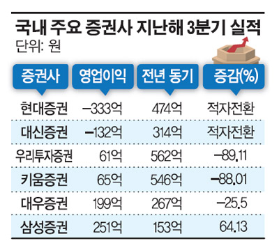 28일 금융감독원 전자공시시스템에 따르면 지난 27일 현대증권은 지난해 3분기 영업손실이 332억9500만원으로 전년 동기대비 적자전환했다고 공시했다. 매출액은 5127억7800만원으로 98.3% 늘었지만 672억1800만원의 순손실을 기록해 적자전환했다.
