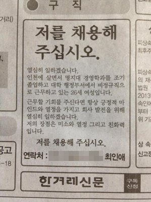 지난달 27일 한 종합 일간지에 "저를 채용해 주십시오"라는 구직 광고가 올라와 인터넷 상에서 화제가 되고 있다.