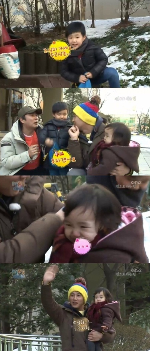 이수근은 수찬에게 “삼촌을 아냐”고 물었지만 대답을 하지 않았고 딸 태은도 낯을 가려 ‘1박 2일’을 함께 외치는 것에는 실패했다.