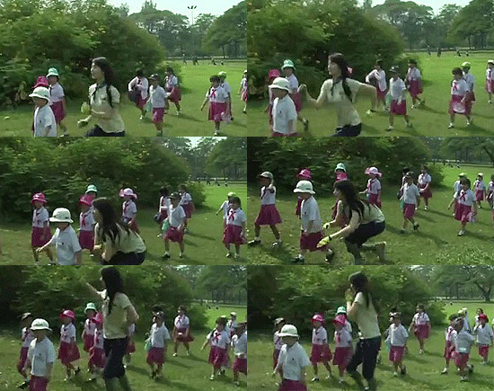 사진 속 수지는 풀밭에 산책 나온 유치원생들과 섞여 함께 걸어가는 모습이다. 특히 수지는 아이들에게 다가가 허리를 굽히며 활발한 모습을 보였다. 하지만 정작 아이들은 수지를 모르는 듯 무심하게 가던 길을 가고 있다.