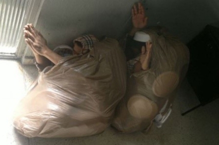 최근 한 온라인 커뮤니티 사이트에는 '탈옥의 결말'이라는 제목으로 사진 한 장이 게재됐다. 공개된 사진에는 두 명의 사람이 대형 비닐봉지 안에 들어가 손과 겨우 머리만 내놓고 봉지안에 찌그러져 있다.