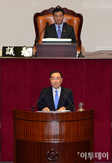 정부조직법 개정안을 두고 여야간 협상이 난항을 겪고 있는 5일 오후 정홍원 국무총리가 국회 본회의장에서 취임연설을 하고 있다. 노진환 기자 myfixer@
