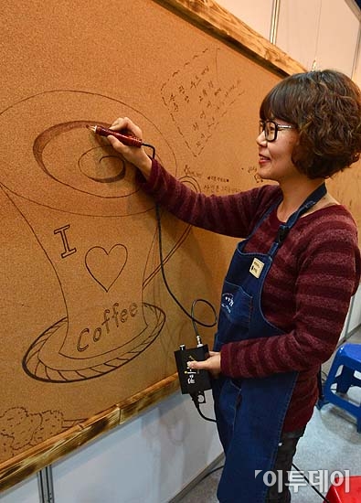 ‘2013 DIY&리폼 박람회’가 6일 오전 서울 강남구 삼성동 코엑스에서 열린 가운데 박람회를 찾은 한 관람객이 인두화를 그리고 있다. 오는 9일까지 열리는 DIY&리폼 박람회는 작게쓰고 빌려쓰고 직접 만들어 사용하는 3대 신(新)소비문화 트랜드를 반영하여 알뜰소비문화 확산을 위해 기획되었다. 방인권기자 bink7119@