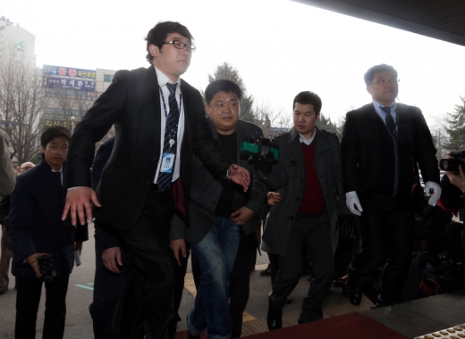 프로농구 승부조작 혐의를 받고 있는 원주 동부 강동희(47) 감독이 7일 오후 경기도 의정부시 의정부지방검찰처에 피의자 신분으로 출두하고 있다. 강동희 감독은 이날 의정부지검 출두 직후 기자들에게 "돈을 받지 않았다. 10년 전부터 (브로커 최모씨와) 금전관계가 있었다"며 혐의를 부인했다.