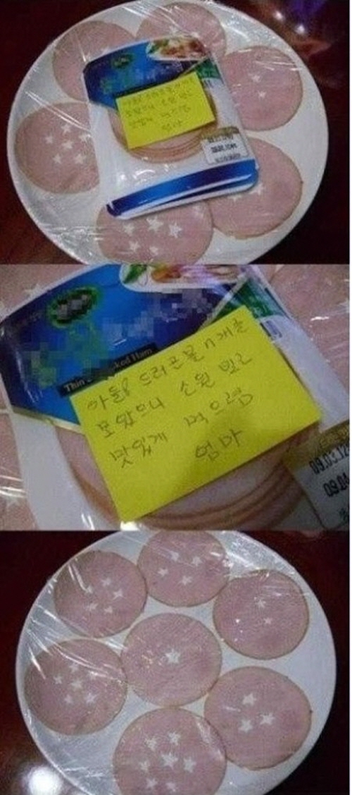공개된 사진에는 엄마가 쓴 편지 한 장과 함께 햄 7장의 모습이 담겨 있다.
