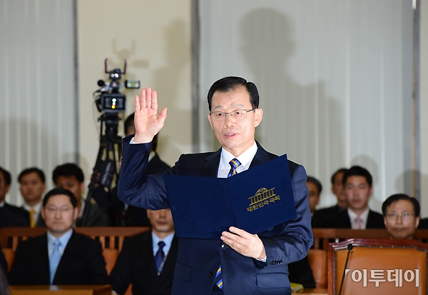 김병관 국방부 장관 후보자가 8일 오전 국회에서 열린 국방위원회 인사청문회에 참석해 선서를 하고 있다. 노진환 기자 myfixer@