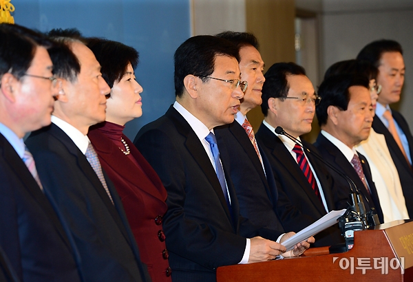 새누리당 초선의원들이 11일 오전 국회 정론관에서 정부조직법의 조속한 통과를 위한 성명서를 발표한 가운데 이현재 의원이 성명서를 읽고 있다. 노진환 기자 myfixer@
