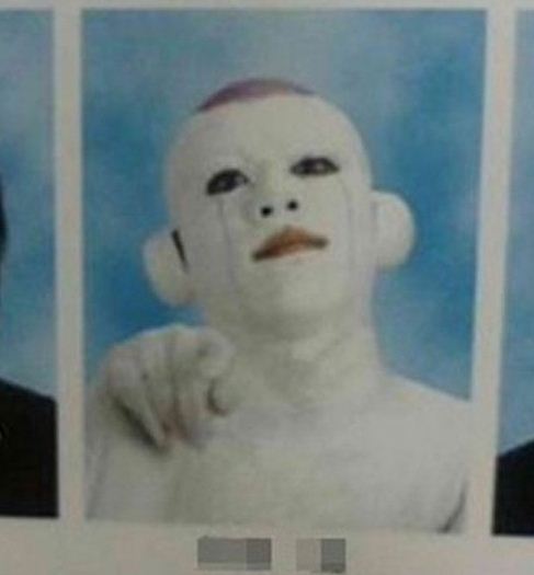 공개된 사진은 졸업앨범 페이지를 찍은 것으로, 한 학생이 애니메이션 ‘드래곤볼’의 악당 ‘프리저’를 연상시키는 분장을 하고 카메라를 가리키고 있다.
