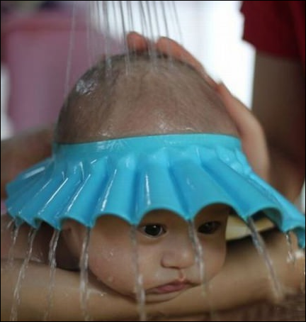 공개된 사진 속에는 아기가 샴푸캡을 쓰고 무뚝뚝한 표정으로 목욕을 하고 있다. 보통의 아기들이 씻을때 울거나 보채는 것과 달리 이 아이는 체념한 듯 엎드려 떨어지는 물줄기를 바라보고 있다.