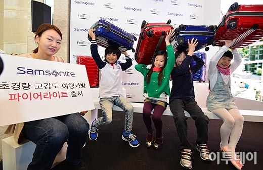 세계적인 라이프스타일 브랜드 쌤소나이트가 12일 오전 서울 롯데백화점 본점 앞에서 초경량 고강도 여행 가방 '파이어라이트'를 선보이고 있다. 이번에 출시된 신제품 '파이어라이트'는 신소재인 커브소재를 활용해 혁신적으로 무게를 줄이고 외형의 변화에도 깨지거나 변형되지 않는 뛰어난 원상회복능력이 특징이다. 방인권기자 bink7119@