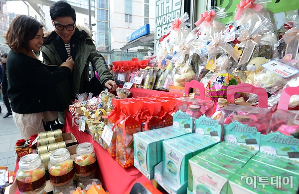 화이트데이를 하루 앞두고 있는 13일 오후 명동 거리에서 한 연인이 사탕과 초콜릿 등 선물을 고르고 있다. 노진환 기자 myfixer@