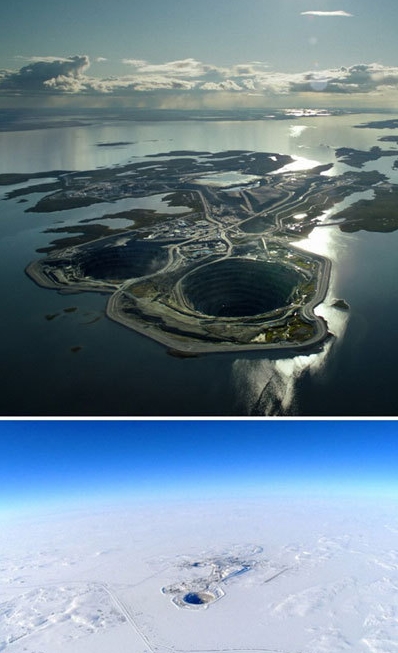 이 구멍은 캐나다 노스웨스트의 호수 라크드그라에 있는 섬에서 다이아몬드를 채굴하기 위해 만들어진 광산인 '디아빅 광산'으로 알려졌다. 광산의 높이는 수면의 높이와 비슷해 겨울에 호수에 눈이 쌓이면 더 장관을 이룬다.