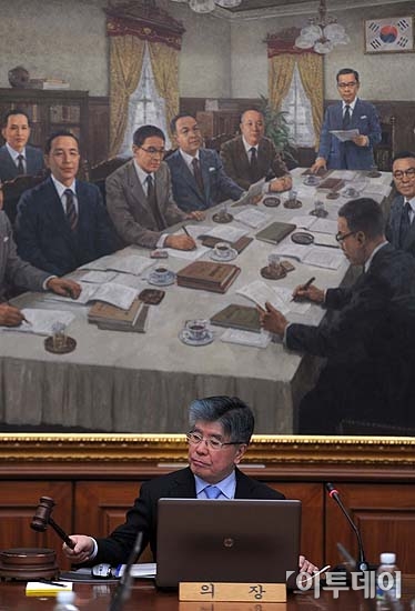 김중수 한국은행 총재가 14일 오전 서울 중구 남대문로 한국은행 본점에서 열린 3월 금융통화위원회 전체회의에서 의사봉을 두드리고 있다. 방인권기자 bink7119@
