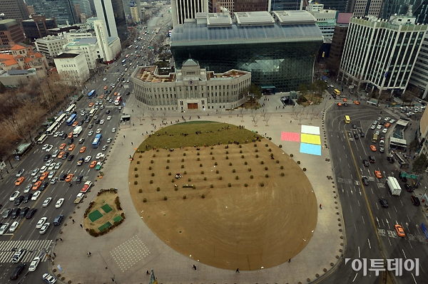 겨울철 스케이트장으로 활용되던 서울광장이 새옷으로 갈아입고 시민에게 개방된다. 14일 오전 서울시 관계자들이 시청 앞 서울광장에 잔디를 옮겨 심고 있다. 노진환 기자 myfixer@